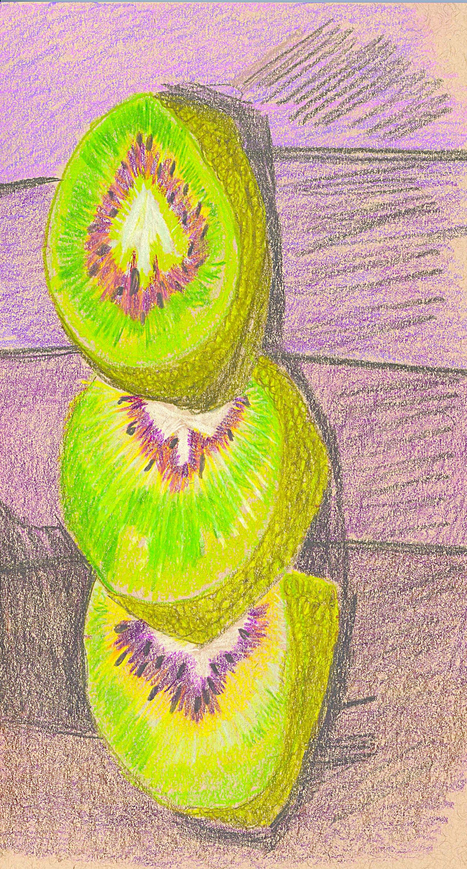 Kiwis is a colored pencil Painting by artist Lisa Godin. Every nuanced color found in kiwis is highlighted in this vivid painting. Bold chartreuse is paired with a lovely violet and pops of white. This colorful painting will be a conversation piece and would look great in any room or given as a one-of-a-kind gift.