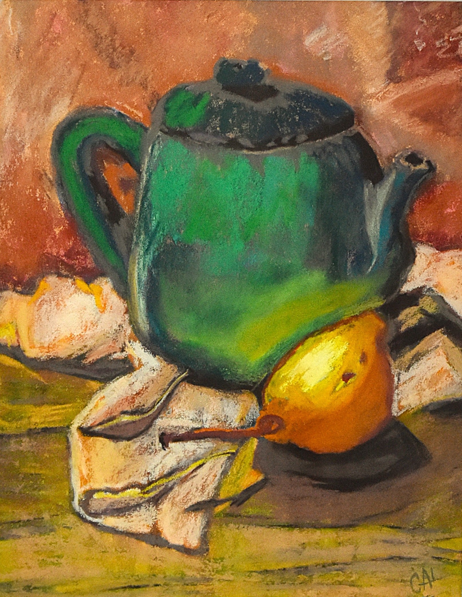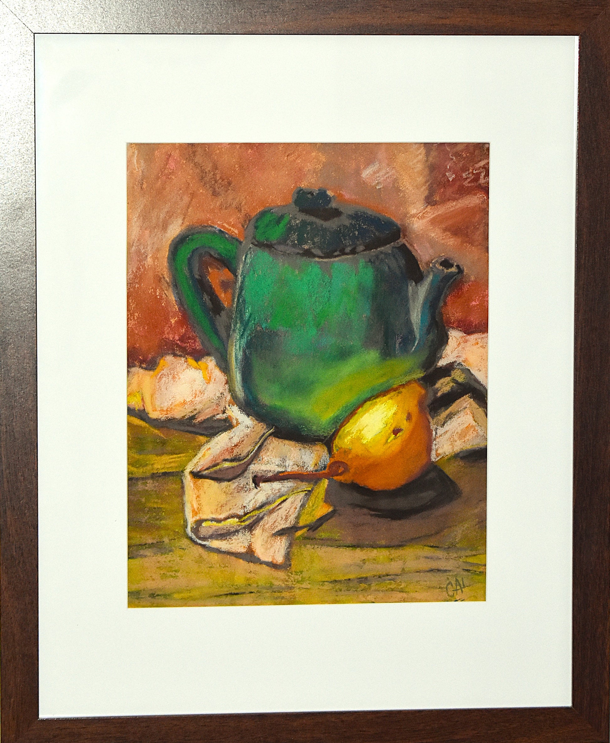 The teapot is the star of this painting, but the terracotta background and lemon are also beautiful. There is a lot to explore in this piece, making it perfect for discerning collectors and art lovers.